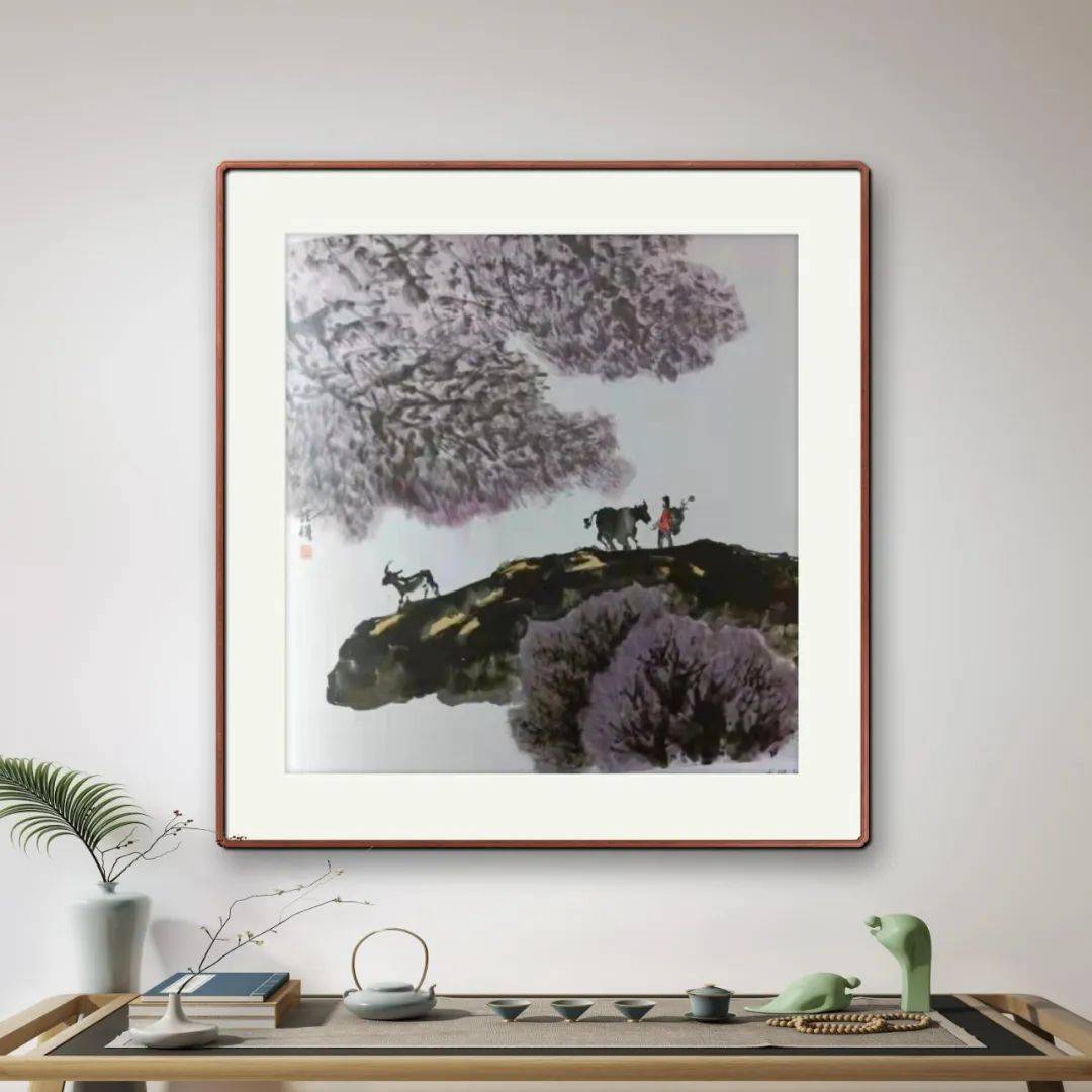 卢兆祥先生将个人情感与思想融入山水描绘,达成情景交融之境。其画作常以简洁笔墨勾勒疏林坡岸、浅水遥岑,流露出超脱世俗、追求高洁的心境。在构图上,他深谙开合疏密之道,采用高远与深远相结合的方式,将主峰置于画面中心,左右山峦开合有序,前景树木巨石疏密得当,使画面层次丰富,气势磅礴,充满节奏感与韵律感。