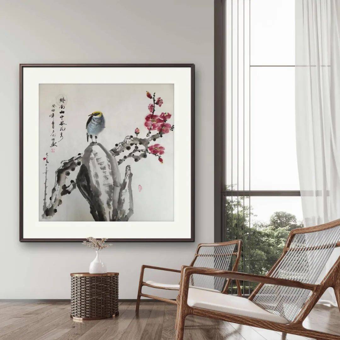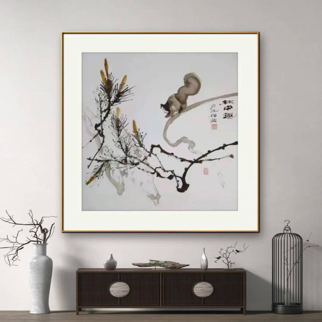 步入卢兆祥先生构建的花鸟世界,仿佛置身于诗意流淌的自然秘境。他善于捕捉生命瞬间的灵动之美,无论是枝头振翅的雀鸟,还是风中摇曳的花枝,都被赋予鲜活的生命力。在构图上,他巧妙运用条幅的纵深感与方形画幅的稳定性,通过疏密有致的布局营造出独特的视觉韵律。画面中,浓淡相宜的枝叶或舒展、或蜷曲,与主体花鸟形成动静相生的和谐关系,于留白处勾勒出无限遐想空间。