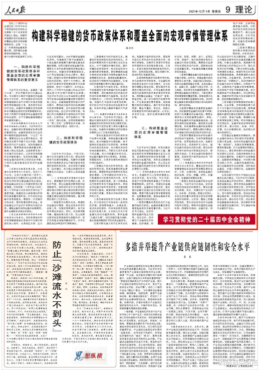 12月4日,人民日报在“学习贯彻党的二十届四中全会精神”专栏,刊发了央行行长潘功胜题为“构建科学稳健的货币政策体系和覆盖全面的宏观审慎管理体系”的文章,传递了一系列信号。