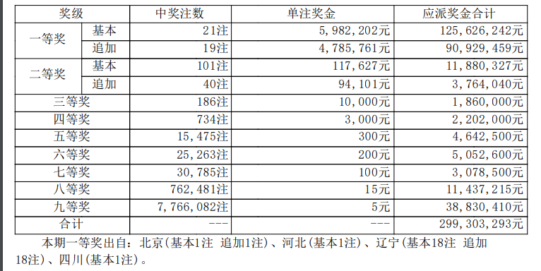 此外,北京、河北、四川等地也有彩民斩获一等奖。