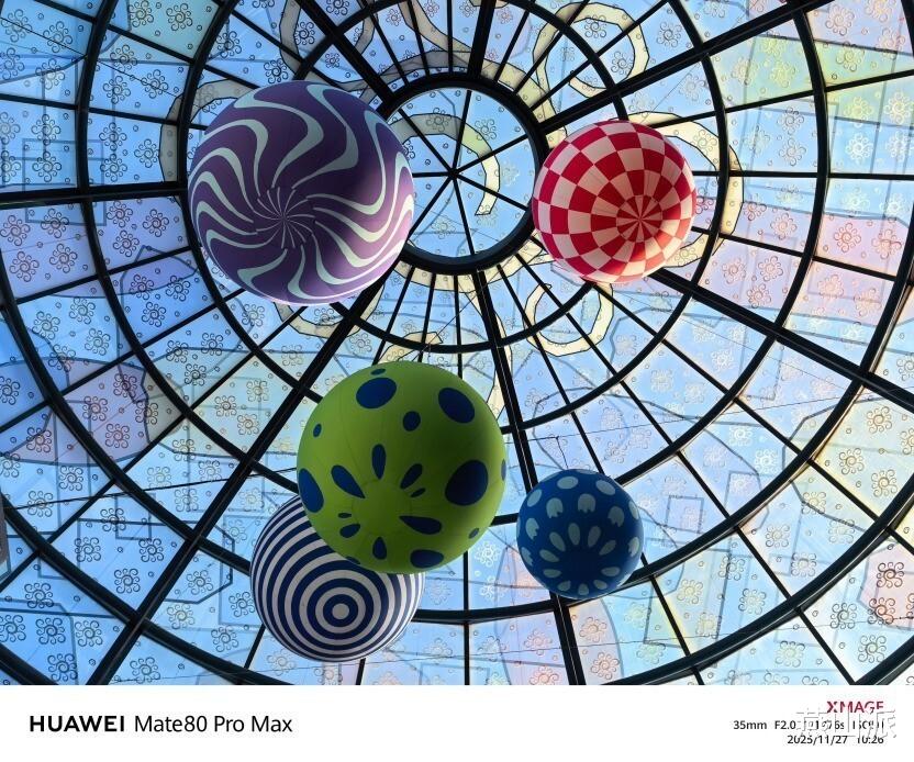 而且华为Mate 80 Pro Max还搭载了5000万像素超高动态主摄,拥有17.5EV的超高动态范围,这意味着在逆光、暗光场景下的拍摄氛围感都更顶。比如说这张室内逆光拍摄的照片,光线透过穹顶漫射下来,而气球间的缝隙光影和底部的阴影清晰却不杂乱,暗处的细节也清晰可辨,画面既有立体感又显高级,色彩还原也十分精准。这种“按下快门即得大片”的稳定感,让我彻底告别了反复调整曝光和后期救片的麻烦。