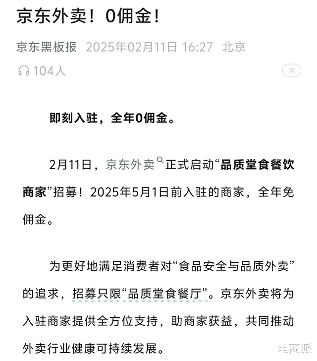 今年2月,京东正式启动“品质堂食餐饮商家”招募。为了吸引更多商家入驻,京东宣布,在今年5月1日之前入驻的商家,全年免佣金。