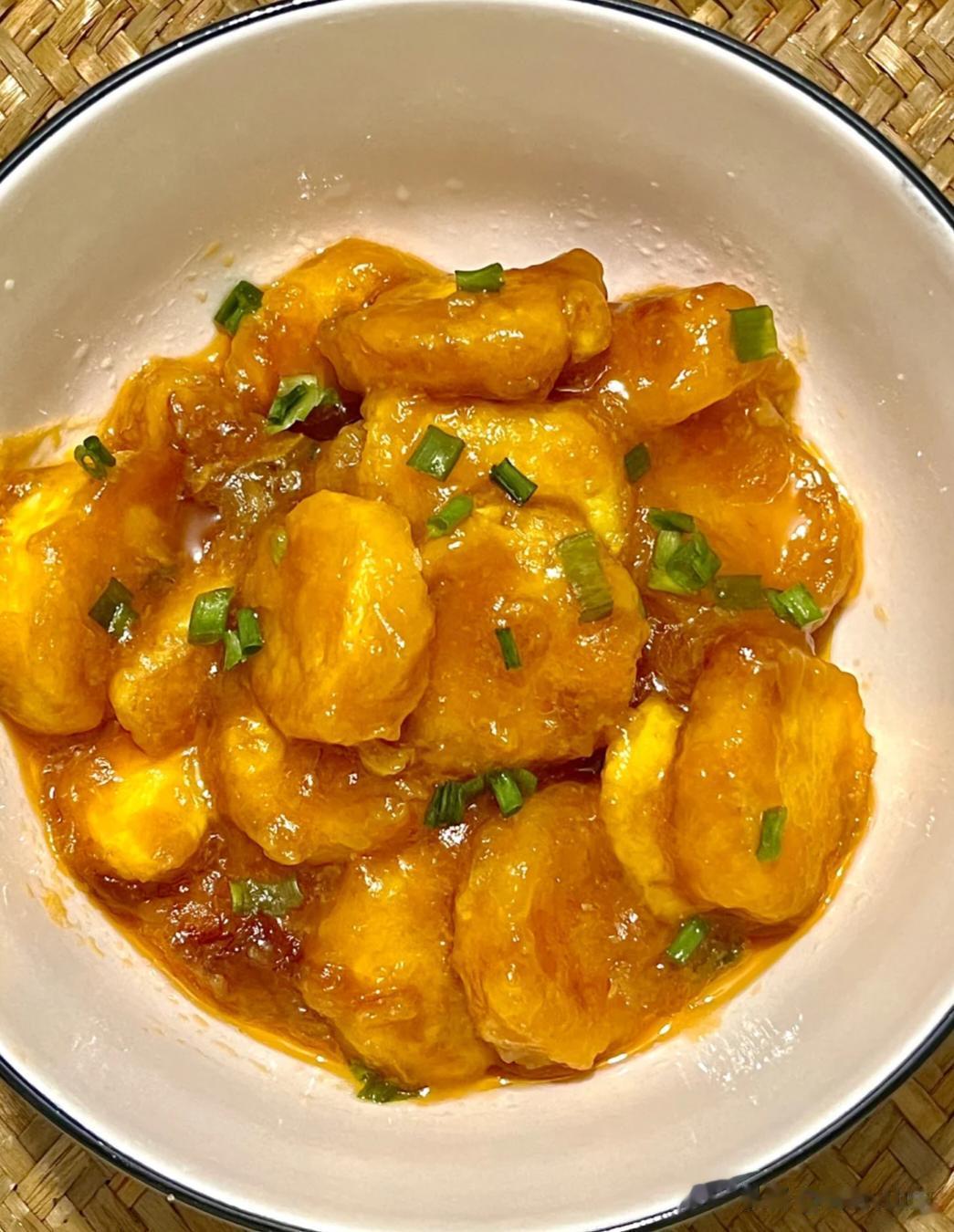 5. 最后点缀:撒上切好的青蒜苗段,轻轻翻拌一下,借助余温让蒜苗的香味释放出来,即可装盘。酱香浓郁,豆腐外韧里嫩!