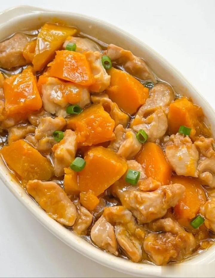 食材准备:南瓜、鸡腿肉、小葱、生姜、酱油、淀粉、食用油