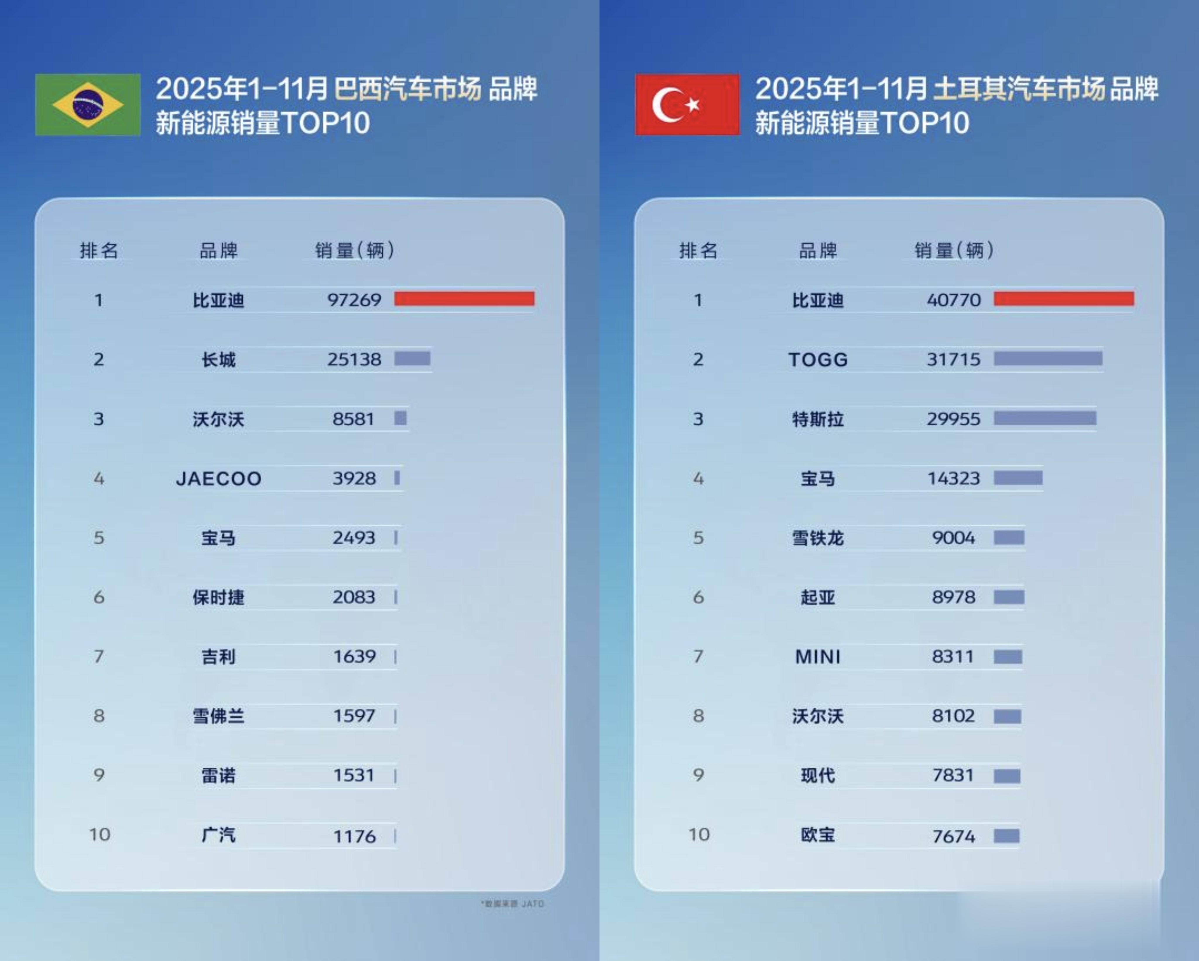 11月,比亚迪在巴西、土耳其、意大利、西班牙、匈牙利、克罗地亚等国拿下了新能源汽车销量第一,在新加坡等国家获得全品牌销冠。多国销冠全面超越,1-11月累计表现同样不俗,在巴西、土耳其、西班牙、意大利等国,比亚迪位列新能源汽车品牌销量榜首;在新加坡、中国香港等地区市场荣膺全品牌销量第一,备受消费者认可。