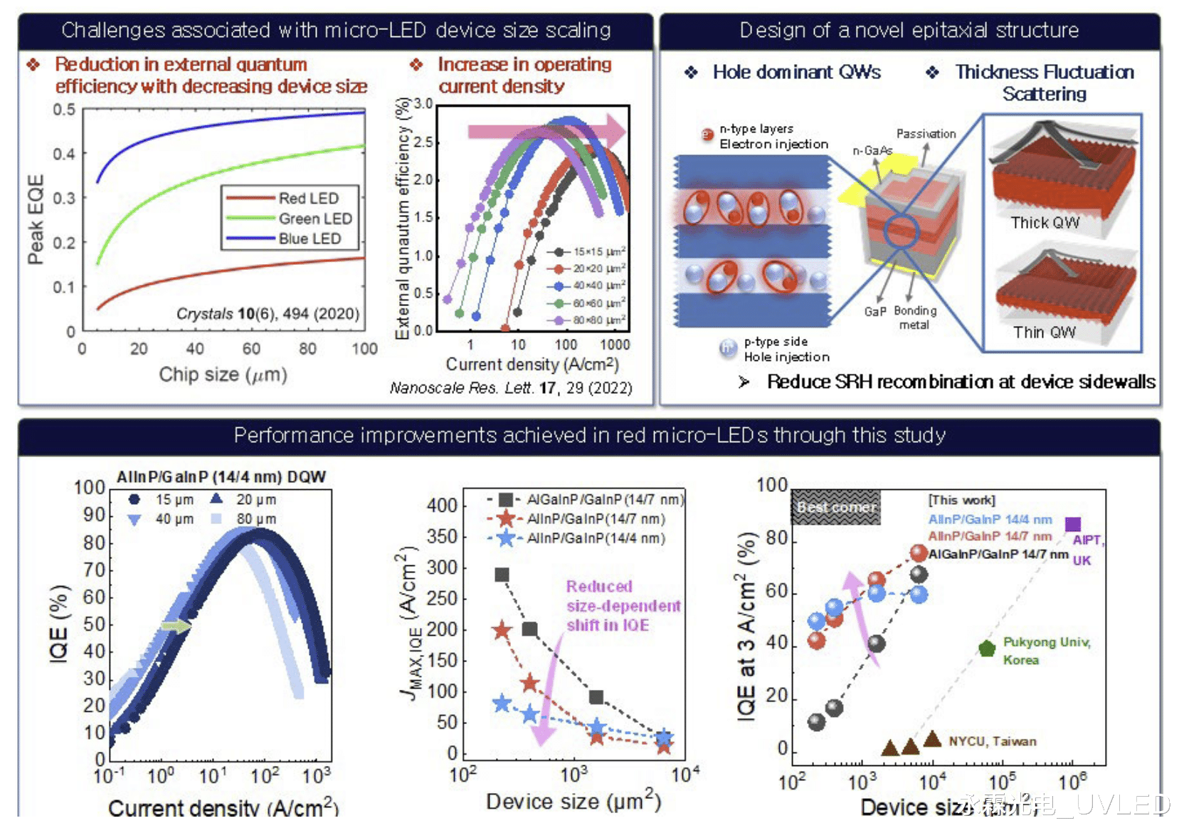 研究团队同时解决了这两个挑战。首先,他们采用了 AlInP/GaInP 量子阱结构,使得红色 micro-LED 即使在极小的像素尺寸下也能实现高效率且能量损失极小。量子阱/势垒结构充当能量势垒,将电子和空穴限制在量子阱层内,防止载流子泄漏。通过采用具有更高空穴浓度的量子阱,研究团队有效减少了像素尺寸减小带来的能量损失,从而实现了更亮、更高效的红色 micro-LED。