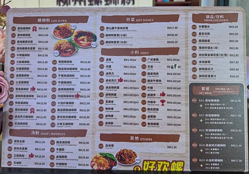 产品价格上,好欢螺这家店的产品定价与国内基本持平。比如原味、干捞等螺蛳粉售价多在14.9-29.9林吉特/份(约人民币25.6-51.4元),三鲜肉粉、叉烧粉等汤粉为12.9-19.9林吉特(约人民币22.1-34.2元)/份,小料价格偏低,每份/个2-9.9林吉特(约人民币3.4-17元)。