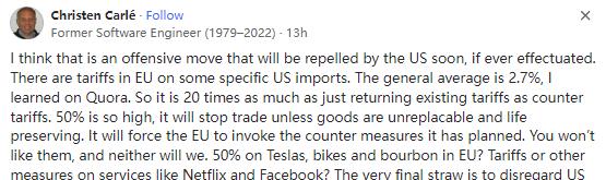 据我所知,欧盟的每一位分析师都不认为这些关税会真正生效,他们认为这只是特朗普的一种谈判策略,或者是虚张声势,如果这样的关税真的生效,将对欧盟和美国的经济造成严重影响。
