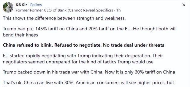 特朗普在与中国的贸易战中退缩了,现在只对中国征收30%的关税,没关系,中国可以接受30%,中国还会像以前一样继续对美国进行出口。