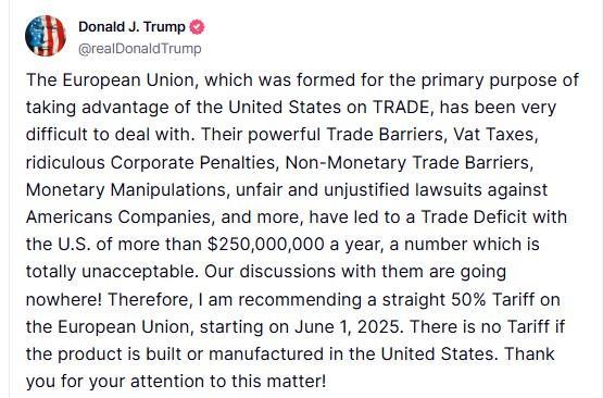 现在特朗普将针对欧盟的关税提高到50%,他认为欧盟很弱,可以被欺负,50%的关税将摧毁欧洲经济,欧盟别无选择,只能让中国成为其主要贸易伙伴,因为特朗普永远不值得信任。