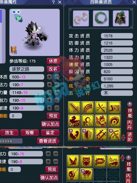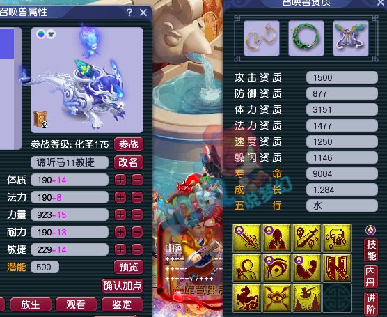 10、5特殊血宝宝执音,同时拥有净台、护盾、神马、死亡、法防技能,速度资质达到了1600点!