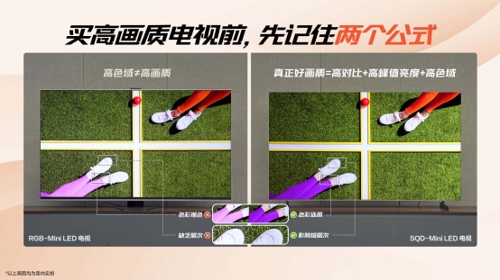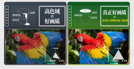 而在Mini LED阵营里,TCL的SQD-Mini LED和RGB-Mini LED 是最受关注的两大方案,两者的核心差距其实很直观。好画质是 “高对比度 + 高峰值亮度 + 高色域” 的铁三角组合,RGB-Mini LED偏科于色域表现,而 SQD-Mini LED则实现了三方面的全面领先。