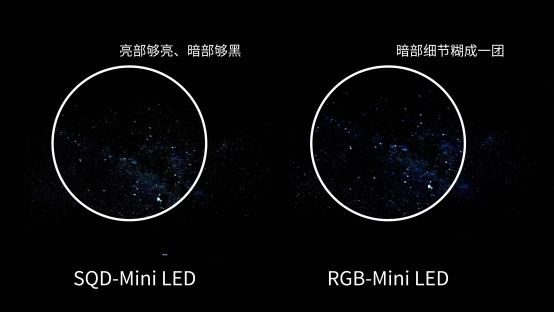 将RGB-Mini LED和SQD-Mini LED放在一起做测试就很清楚:同一画面下,SQD-Mini LED对比度更高,通透感和细节丰富度会肉眼可见地提升。TCL Q10M系列的SQD-Mini LED技术,正是抓住了对比度这个核心,通过万象分区技术实现极致控光。一颗灯就是一个有效分区,同等成本下分区数量能达到 RGB-Mini LED 的3-6倍,亮部够亮、暗部够黑,夜晚星空的暗部细节都能清晰呈现。