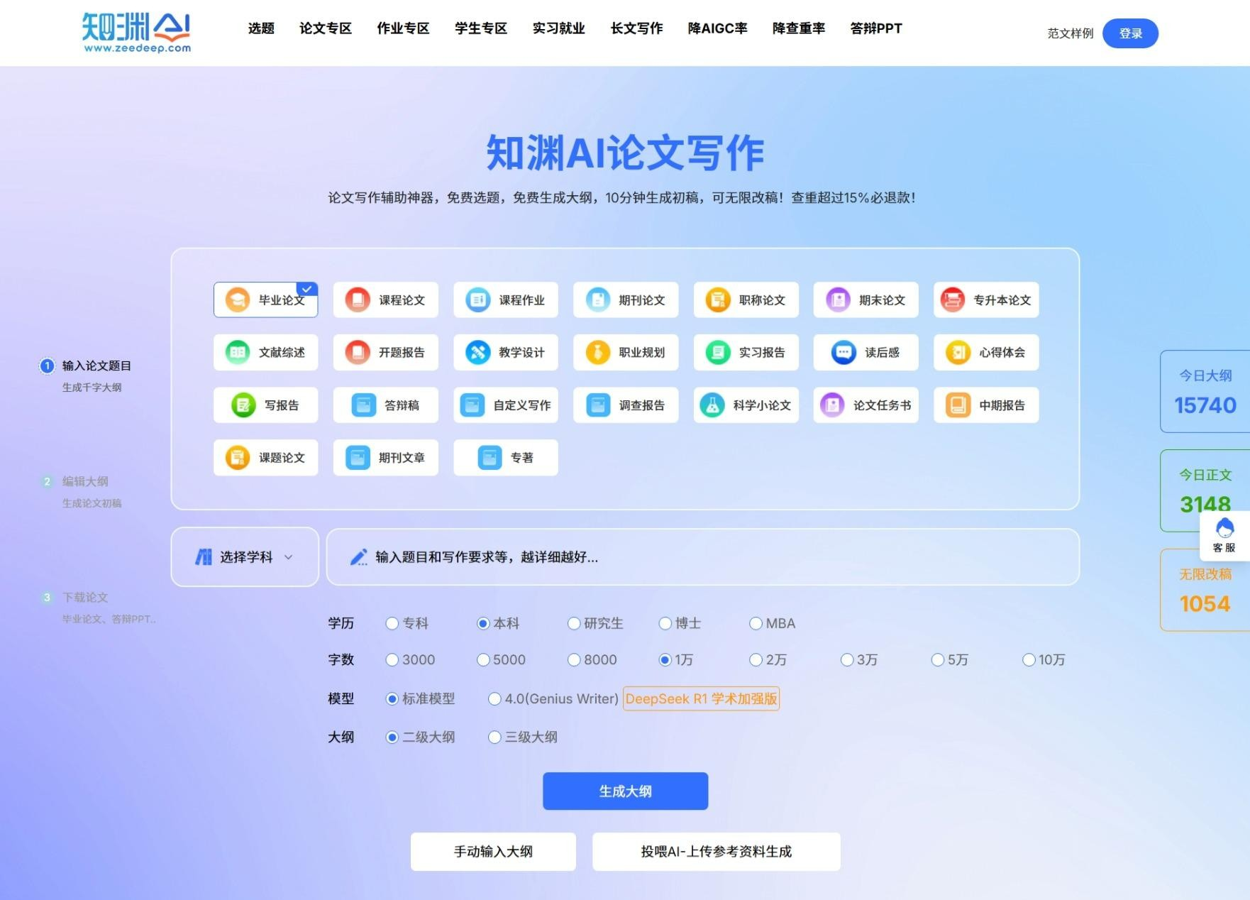 同样搭载AI4.0技术,支持实时联网获取最新资料,免费生成千字大纲,输入关键词就能得到详尽框架,还能手动修改,灵活性很高。「投喂AI」功能也很实用,上传文献和研究背景后,生成的内容贴合专业需求,700+学科全覆盖,专科到博士的论文、职称论文、专升本论文都能搞定。