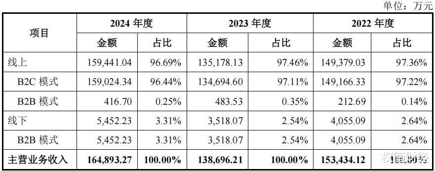 公司以线上B2C为主要销售模式,报告期内线上B2C模式销售收入分别为14.917亿元、13.469亿元和15.902亿元,占主营业务收入的比例分别为97.22%、97.11%和96.44%。