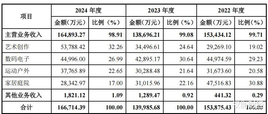 2022年-2024年,公司艺术创作类产品实现销售收入分别为2.927亿元、3.45亿元和5.379亿元,占主营业务收入的比例分别为19.08%、24.87%和32.62%。公司艺术创作类产品销售收入大幅增长,2023年同比增长17.86%,2024年同比增长55.92%。公司艺术创作类产品以Ohuhu品牌为主,主要产品为绘画笔。