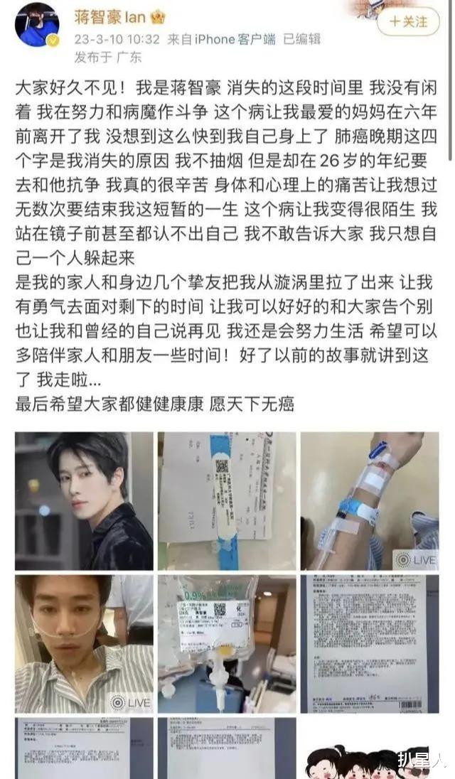 今日午间,#青春有你3选手蒋智豪患肺癌# 这一话题迅速占据热搜榜首,牵动了无数网友的心。年仅28岁的蒋智豪,曾是在选秀舞台上闪耀的明星,以歌手和演员的双重身份赢得了众多粉丝的喜爱。然而,命运对他并不宽容。2023年3月10日,蒋智豪在社交平台上透露,自己已被确诊为肺癌晚期。令人震惊的是,他不曾沾染烟草,却在年仅26岁时就承受了身心的双重折磨。为了全力治疗,他不得不暂时离开心爱的舞台。今日,正值蒋智豪28岁生日之际,他在社交平台上发文表示,尽管最近病情并不稳定,但他依然坚韧地挺了下来。面对巨大的挑战和痛苦,蒋智豪展现出了顽强的生命力和坚定的信念,让人深感敬佩。蒋智豪的遭遇让我们深刻认识到健康的重要性,也提醒我们要珍惜生命、关爱自己。在这个特殊的日子里,让我们为蒋智豪送上最诚挚的祝福,希望他能战胜病魔,早日康复。同时,也让我们共同关注肺癌这一严重疾病,为防治肺癌贡献一份力量。#为蒋智豪加油# #战胜病魔# #关注肺癌#