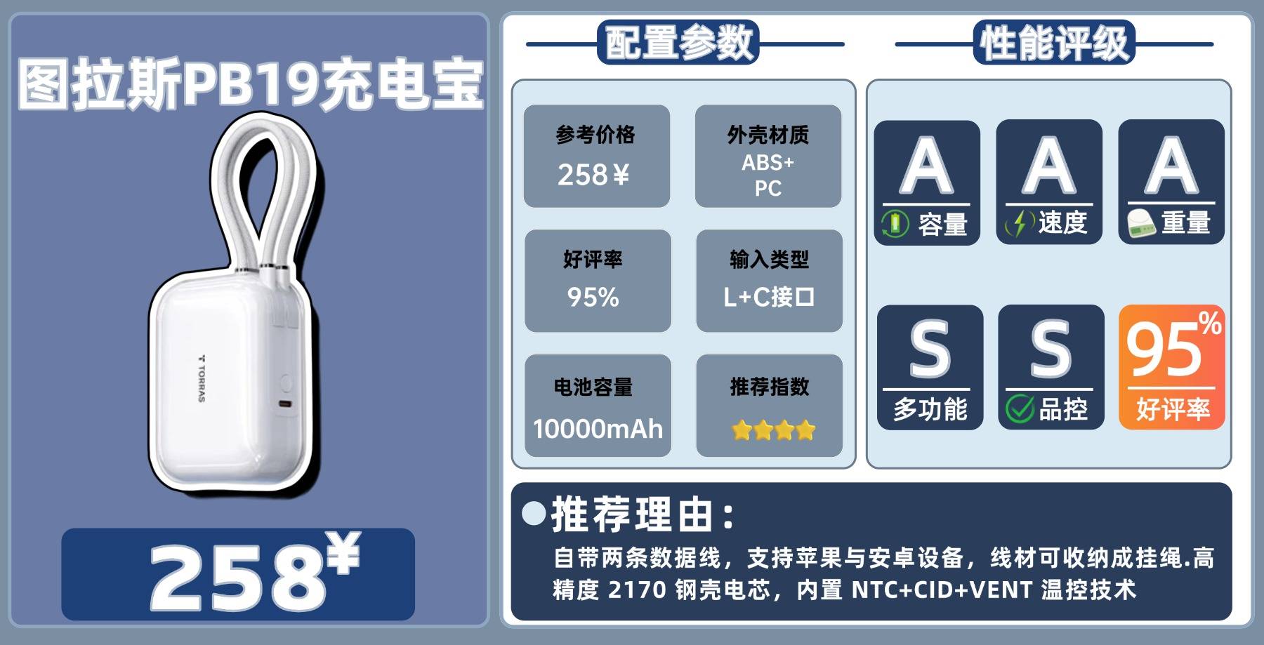 西圣PB‑S在兼顾安全、能效与长效续航的前提下,搭载 10000mAh 大容量电芯,支持 22.5W PD 快充,充电效率大幅提升,30 分钟即可充入约 55% 电量,轻松满足一天外出或短途差旅的需求。机身重量仅约 170g,尺寸仅 74.5×60×28.4mm,比一包手帕纸还小,单手握持轻盈便捷,随身携带毫无负担。内置 Type‑C 与 Lightning 双接口线材,创新收纳设计,即拿即用,无需额外携带数据线,更加方便。无论是性能、安全还是便携体验,这款充电宝都达到了相对完善的水准,实至名归2026年度最强充电宝。