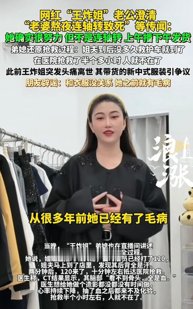 事情马上就冲上了热搜,很多网友都认为是生前穿的那件黑色衣服寓意不好,也有网友认为是经常连轴转直播导致发病,而近日,王炸姐的老公直播回应了这些传闻,我们才知道更多内幕。