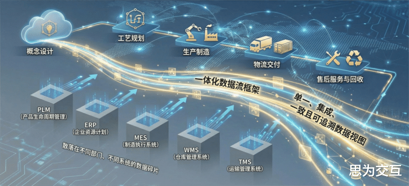 数字线程的本质,并非又一个信息系统,而是一个贯穿产品从概念设计、工艺规划、生产制造、物流交付,直至售后服务与回收的全生命周期,旨在提供单一、集成、一致且可追溯数据视图的一体化数据流框架 。 它像一根无形的线,将过去散落在不同部门、不同系统(如PLM、ERP、MES、WMS、TMS)中的数据碎片,串联成一个具有上下文逻辑的完整数据链条 。