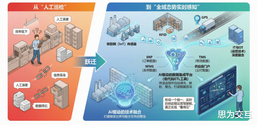 首先,AI驱动的技术融合打破了物理世界与数字世界的壁垒。通过在工厂设备、仓库货物、运输车辆上部署物联网(IoT)传感器、RFID、GPS等终端,结合IT与OT(运营技术)的深度融合,物理世界的每一个脉动——设备状态、物料位置、环境参数——都被实时采集并数字化 。