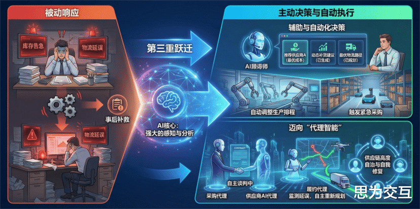 如果说数字线程构建了供应链的“神经网络”,那么人工智能(AI)则为其注入了“灵魂”,使其从一个被动的数据管道,跃升为具备感知、分析和决策能力的智能有机体。这一过程,可以分为三重跃迁。