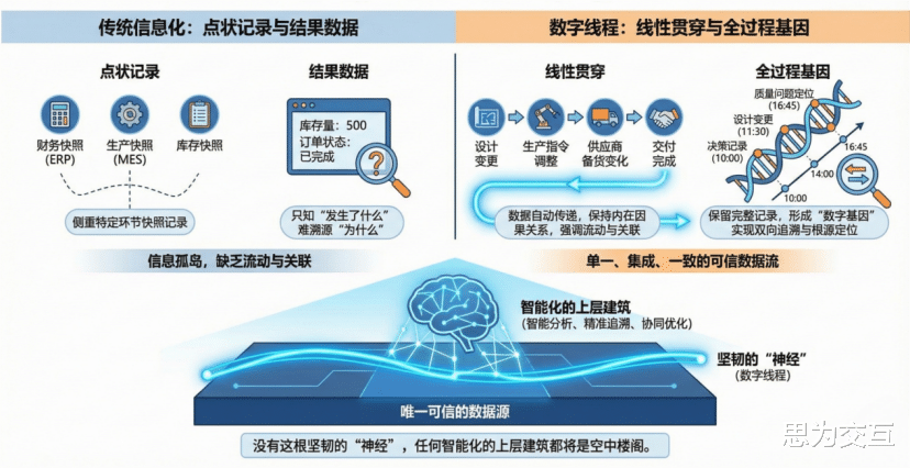 从“点状记录”到“线性贯穿”:传统的ERP或MES系统,更侧重于对特定环节(如财务、生产执行)的数据进行“快照式”的记录。而数字线程强调的是数据的“流动”与“关联”。它确保了从设计变更到生产指令调整,再到供应商备货变化的每一个环节,数据都能自动、准确地传递,并保持其内在的因果关系 。