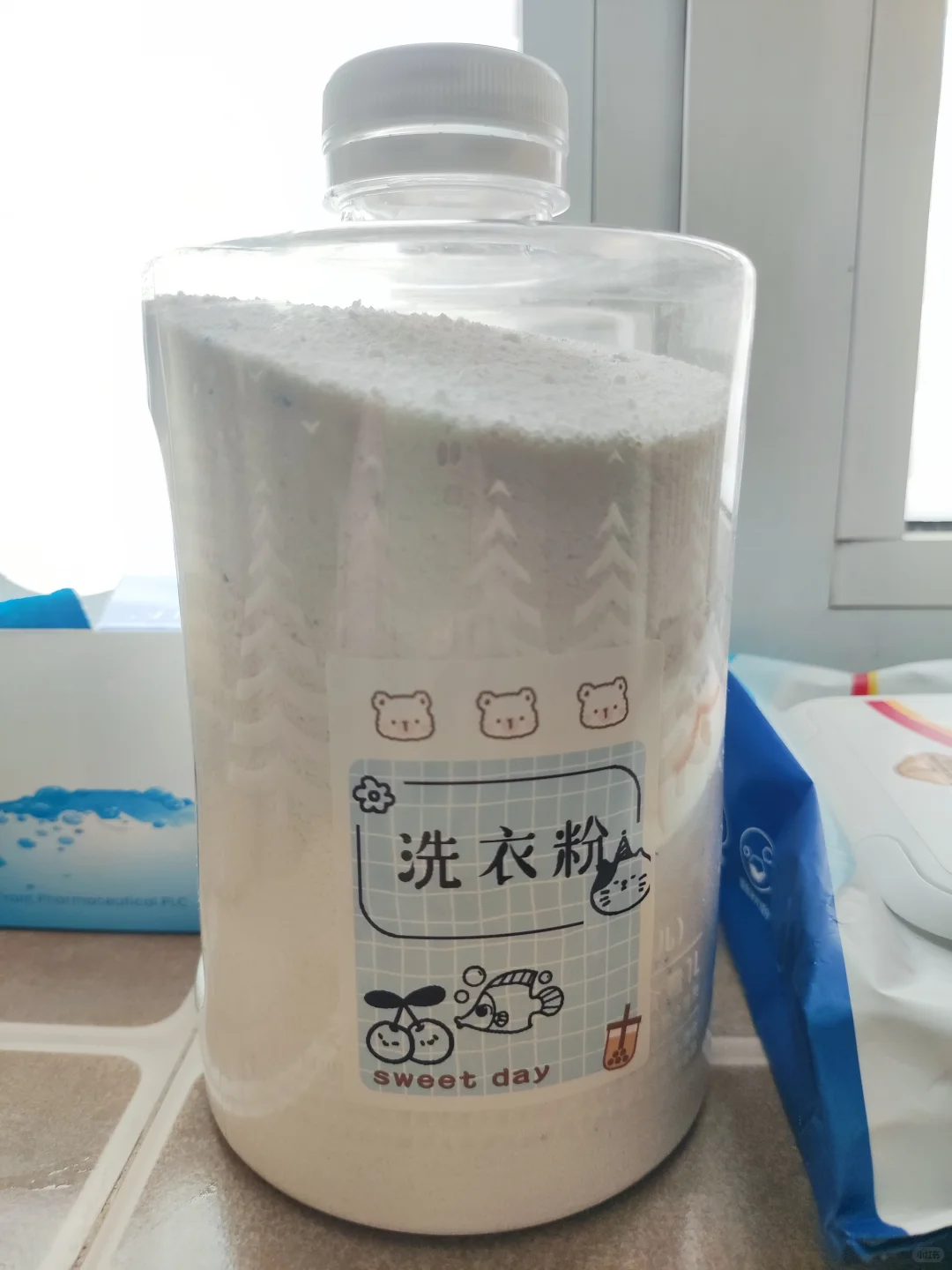 老妈说最好用的瓶子还是尖叫瓶子,她把瓶盖上的硅胶阻头戳掉,然后把洗衣粉装在尖叫瓶子里。用的时候直接倒就可以了,还能控制量,不担心倒多。
