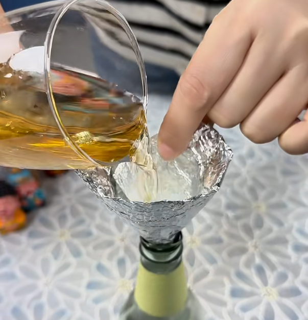 她会用锡纸直接叠出一个漏斗的形状,然后就可以用来分装调料了。当分装了所有的液体调料之后就可以把锡纸扔掉,也不用再次清洁,非常方便。