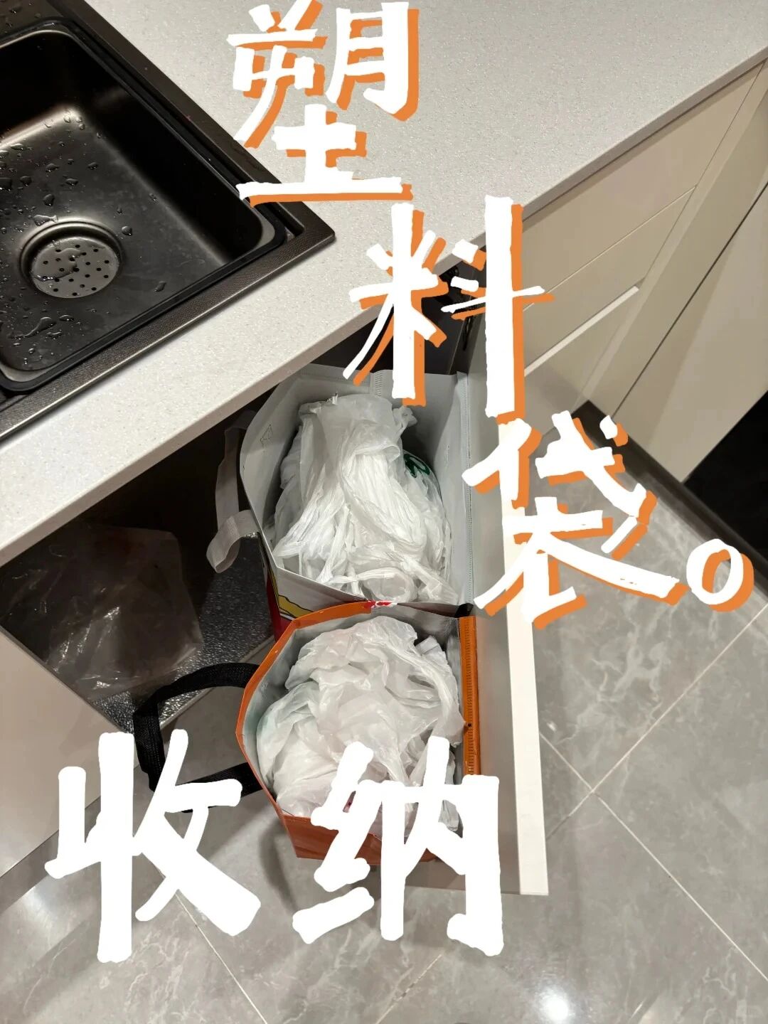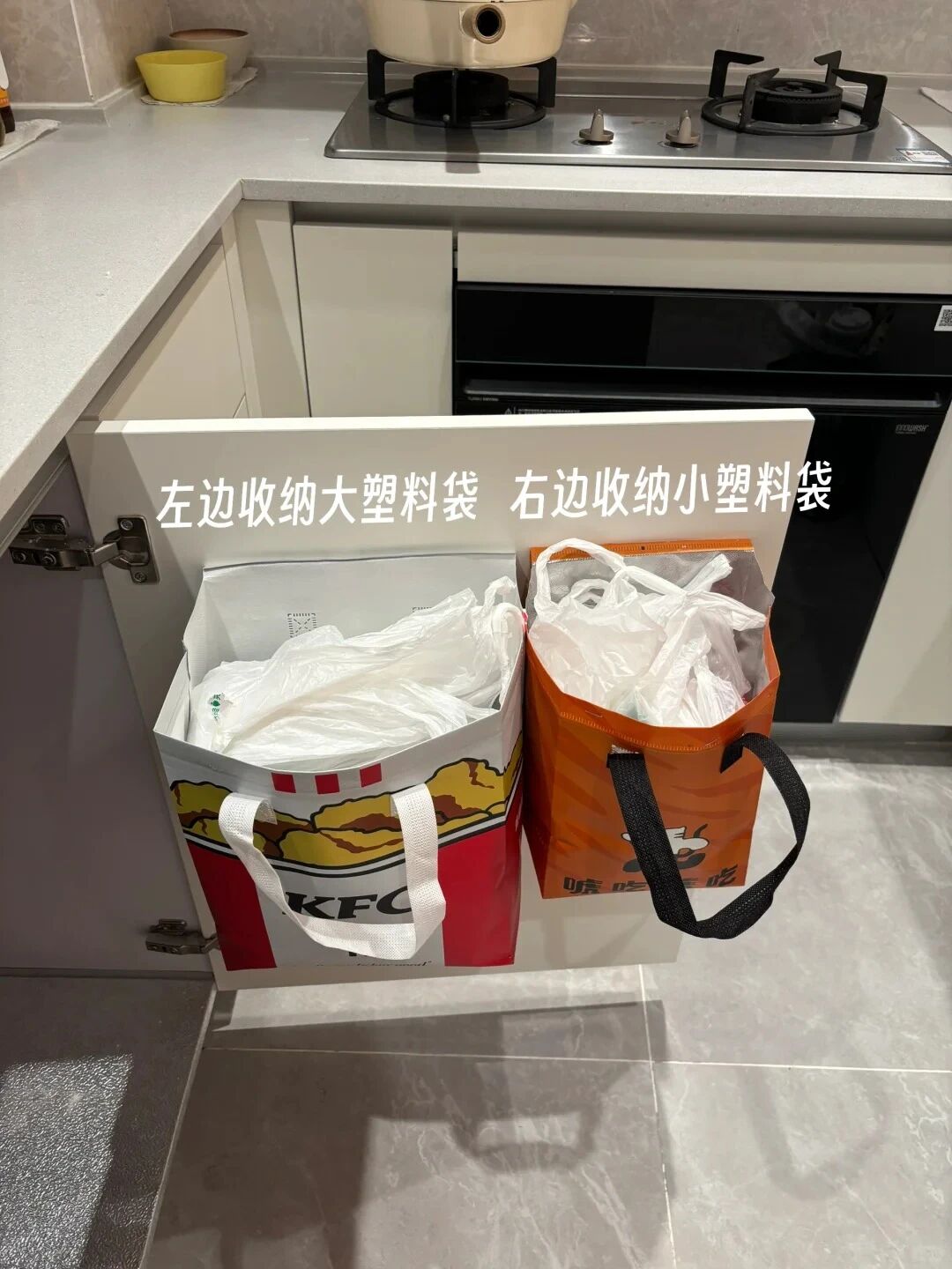每次买菜回来剩下的塑料袋,打一个结之后就扔在这个收纳袋里。每次倒完垃圾,打开柜门,直接拿袋子套到垃圾桶上,非常方便。