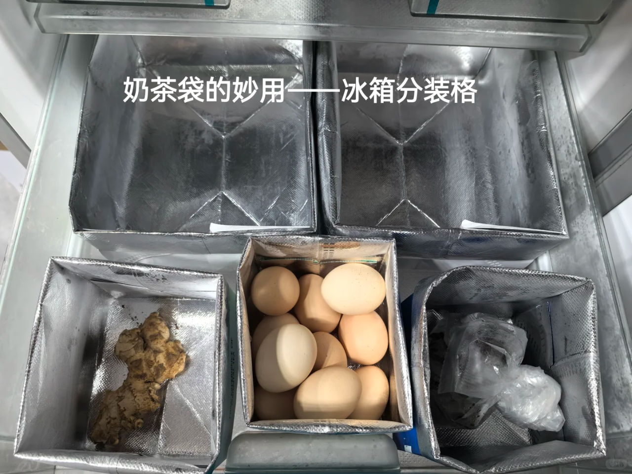 他说冰箱盒不仅花钱,而且占地方。而外卖袋不仅不花钱,而且可以自定义高低。无论装什么都很随意,脏了也可以清洗一下,继续使用。
