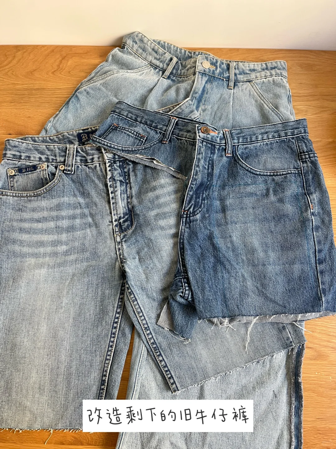 如果裤兜数量不够,也可以裁剪牛仔裤其他的部分缝在底布上,然后挂在墙上,我们就得到了一个壁挂收纳袋。