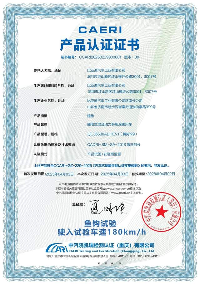 4月16日,腾势N9通过权威机构中国汽研测试认证,以180km/h的速度再次刷新全球鱼钩测试纪录。腾势N9也成为国内首款获得权威机构鱼钩测试认证的车型。之前,在腾势N9发布会上官方公布的鱼钩测试成绩是160km/h,在安全的宣传上,比亚迪很务实、很保守,鱼钩测试能做到180km/h的速度,却只宣传160km/h。