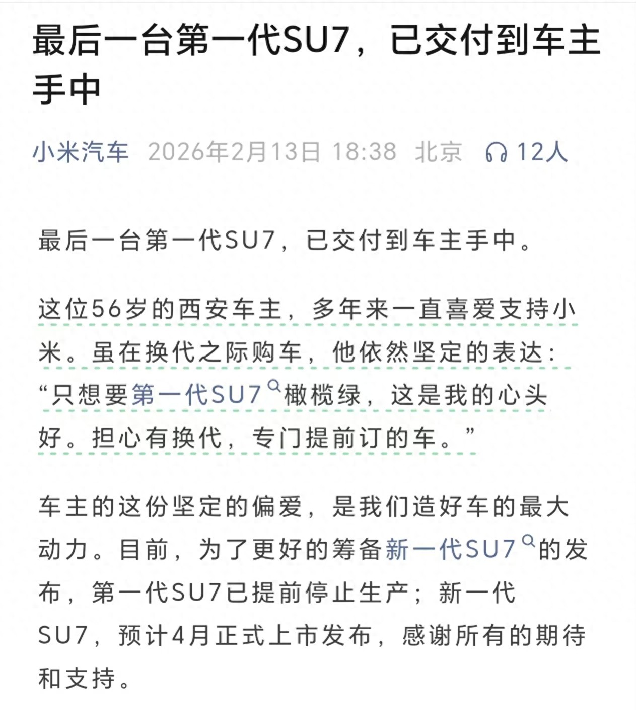 2月13日晚间,小米汽车发布消息称,最后一台第一代SU7已交付到车主手中。小米汽车表示,目前为了更好的筹备新一代SU7的发布,第一代SU7已提前停止生产;新一代SU7预计4月正式上市发布。