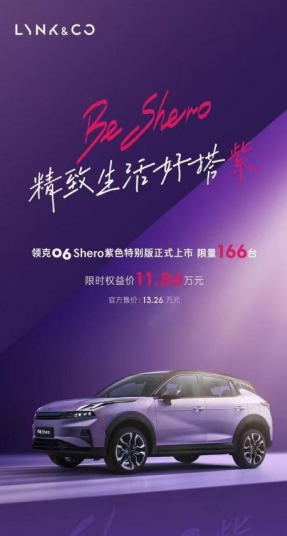 领克 06 Shero 紫色特别版靠着高颜值、高配置,把情绪价值和实用价值都拉满了,让当代女性每次开车出门都更自信、更有范儿。而且,领克 06 Shero 紫色特别版还和六福珠宝联名了,买车就送金钞,仪式感十足。在各种权益的加持下,现在领克 06 Shero 紫色特别版限时权益价只要 11.86 万元,限量 166 台。要是有想买车的朋友,可一定得抓住这个机会,错过了可就太可惜啦 。
