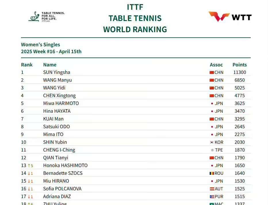本次排名的变化,也反映了WTT赛事的一些动态。