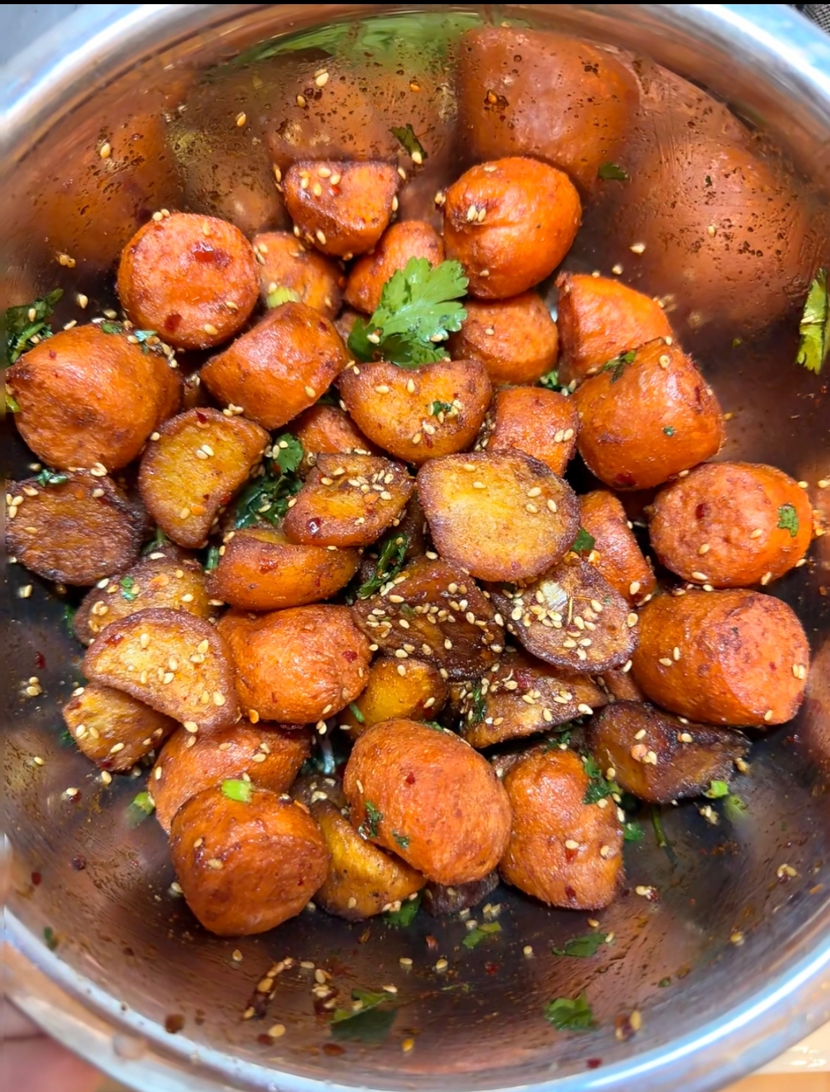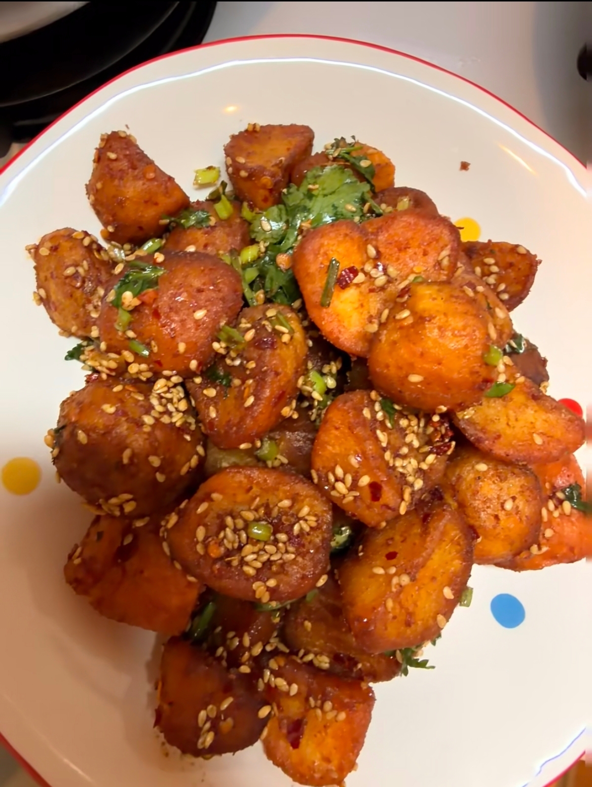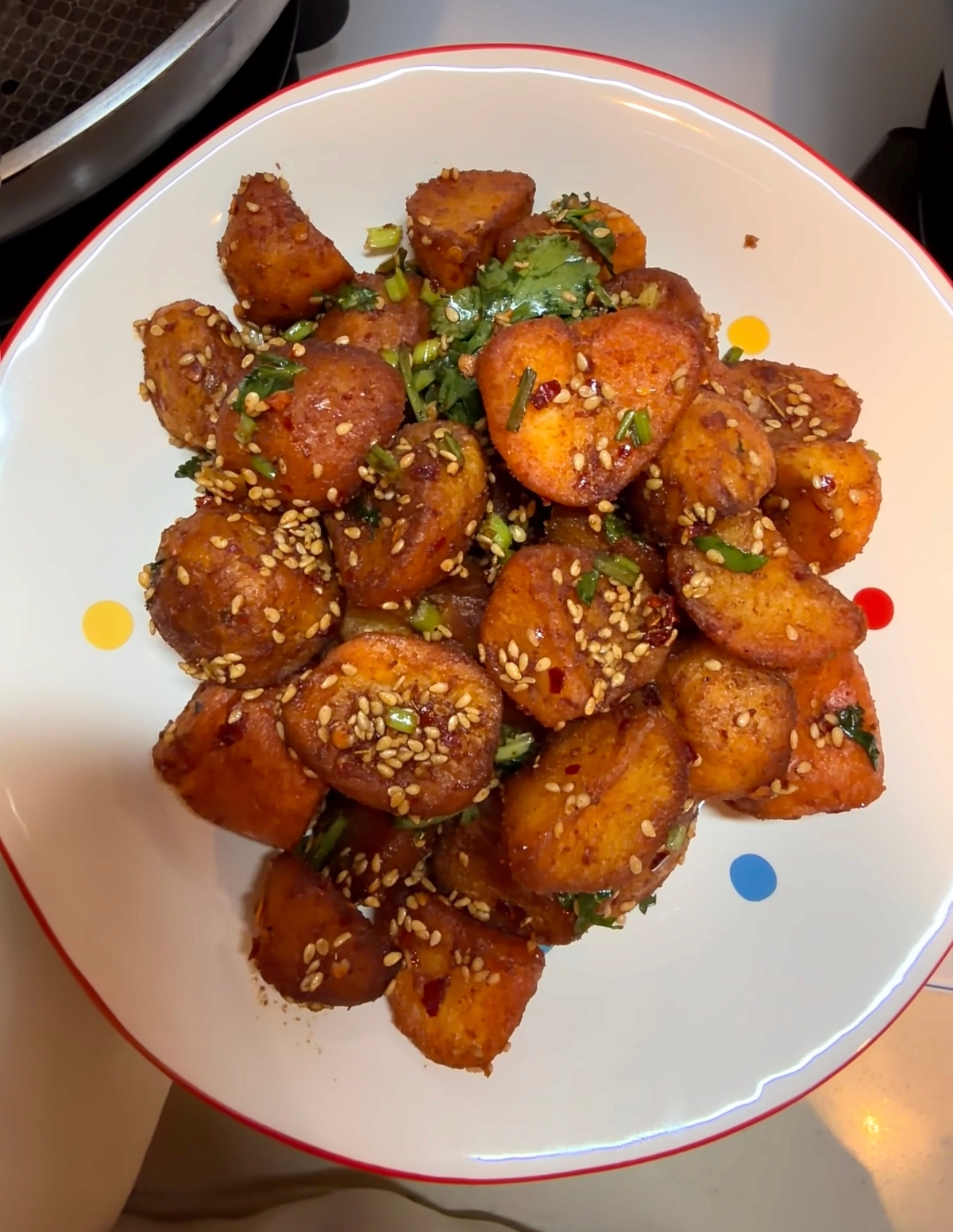 最后,将炸得金黄酥脆、热气腾腾的土豆倒入调好的料碗中。趁热快速翻拌,让每一块土豆都均匀地裹上红亮诱人的酱汁。此时,撒上一把切好的葱花和香菜段,再次拌匀。香菜的清新与葱花的辛辣,在高温的激发下,与浓郁的酱汁完美融合。
