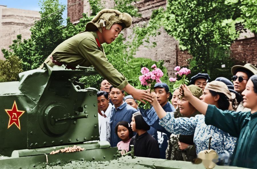 照片中,一位解放军战士坐在坦克上,俯身向前接过群众递来的鲜花;周围各族各界群众伸手,脸上满是热切与喜悦,尽显群众对解放军的拥护与期盼。