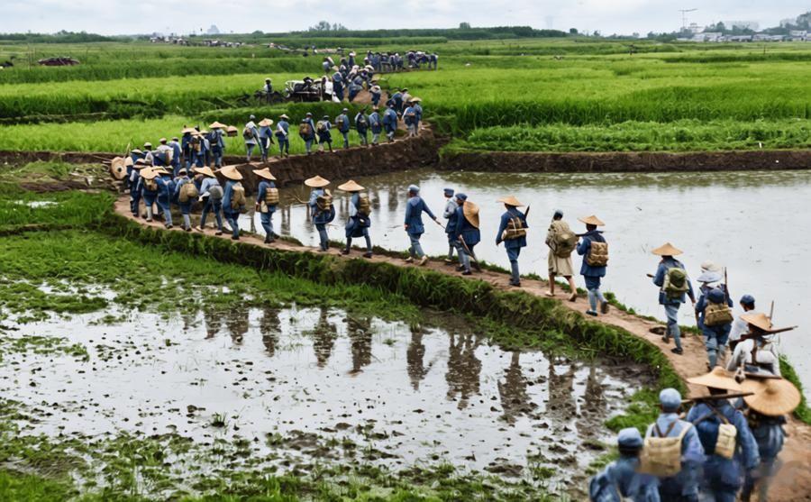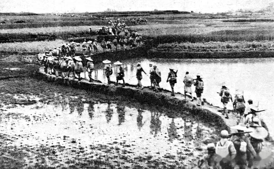 1949年5月,解放上海战役期间,江南水乡中解放军艰难行军,狭窄泥泞的田埂两侧是连片水田,解放军战士们头戴斗笠、背负装备,有的撑着伞遮雨,有的蹚过浅水区,排成队伍沿田埂穿插行进。