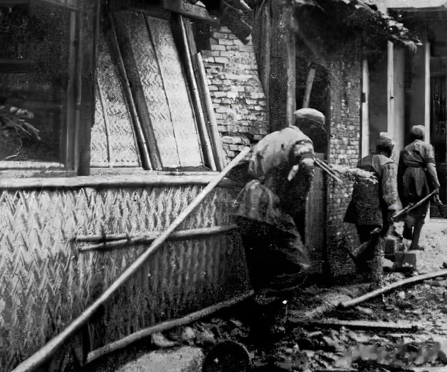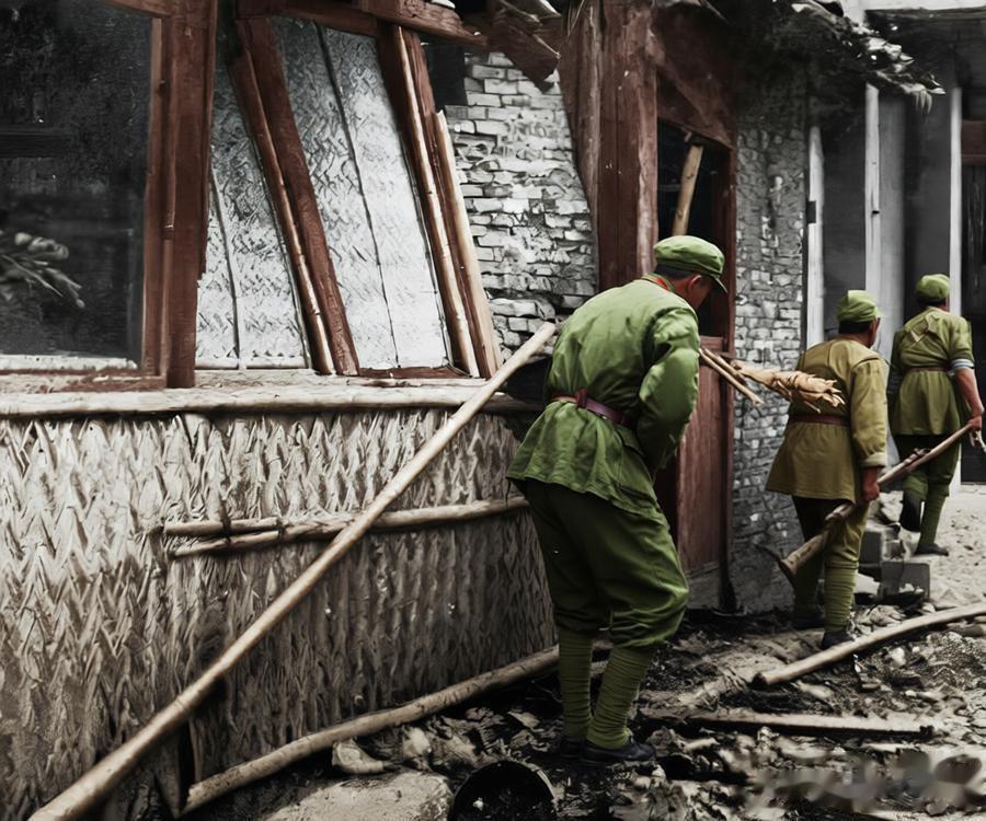 这张照片,定格了解放上海战役月浦之战的战场瞬间,残破的街巷里,墙体砖石裸露、门窗破损歪斜,地面散落着残木与杂物,处处是战斗摧残的痕迹;