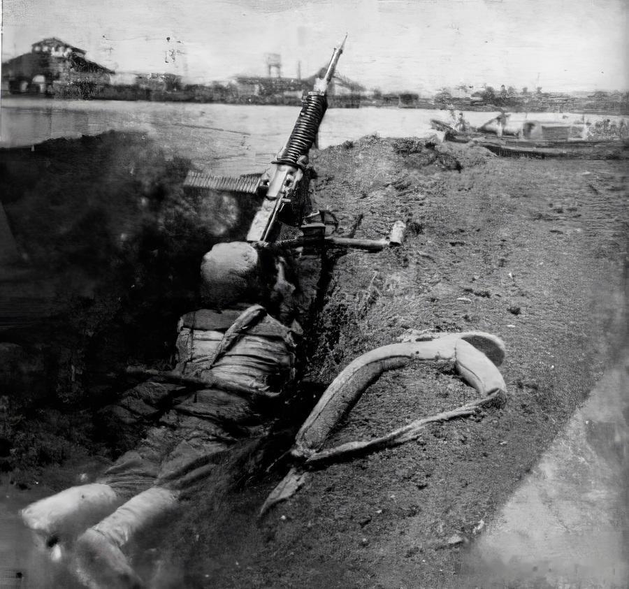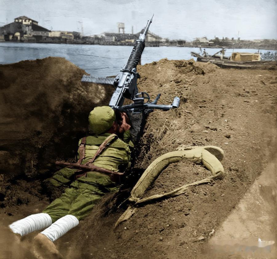 解放上海浦东战场,一名解放军战士隐蔽在临时挖掘的土制战壕里,身前架着机枪,战壕外是泥泞的土地;远处可见河流与船只。
