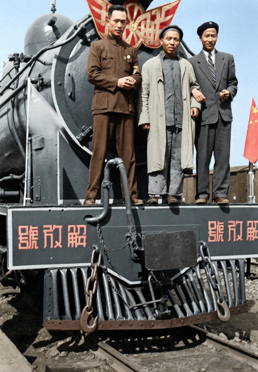 1949年12月9日昆明解放后,当地人员紧急抢修出这台“解放号”机车,专程前往宜良迎接解放军进城,蒸汽机车车头清晰标着“解放号”字样,三位不同着装的人员并肩站在车头前。这既是后勤保障的实际行动,也藏着昆明民众对解放的热切期盼。