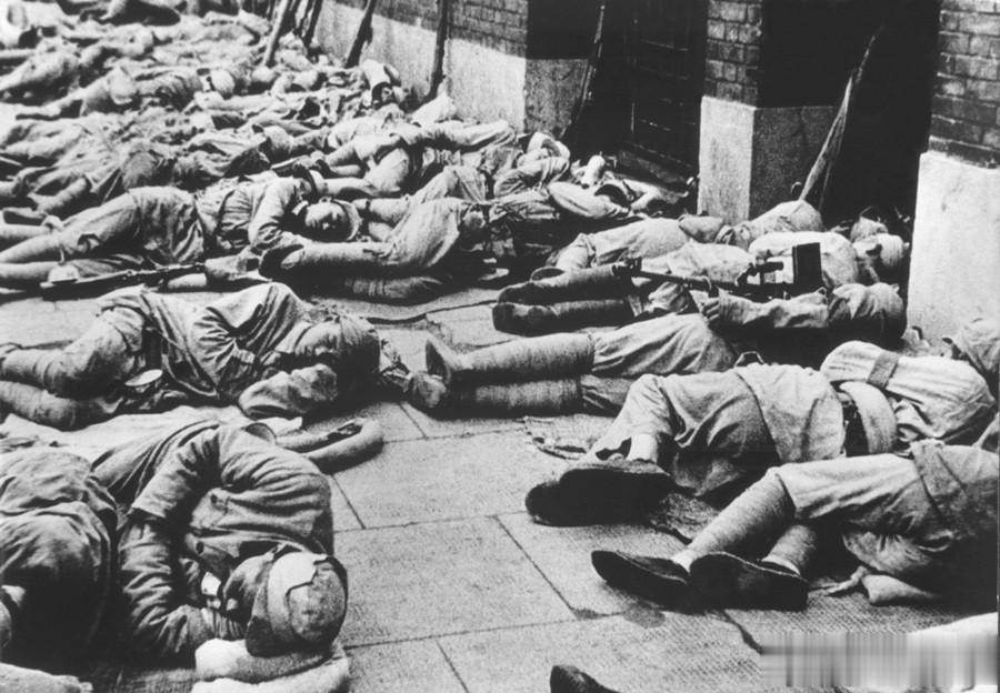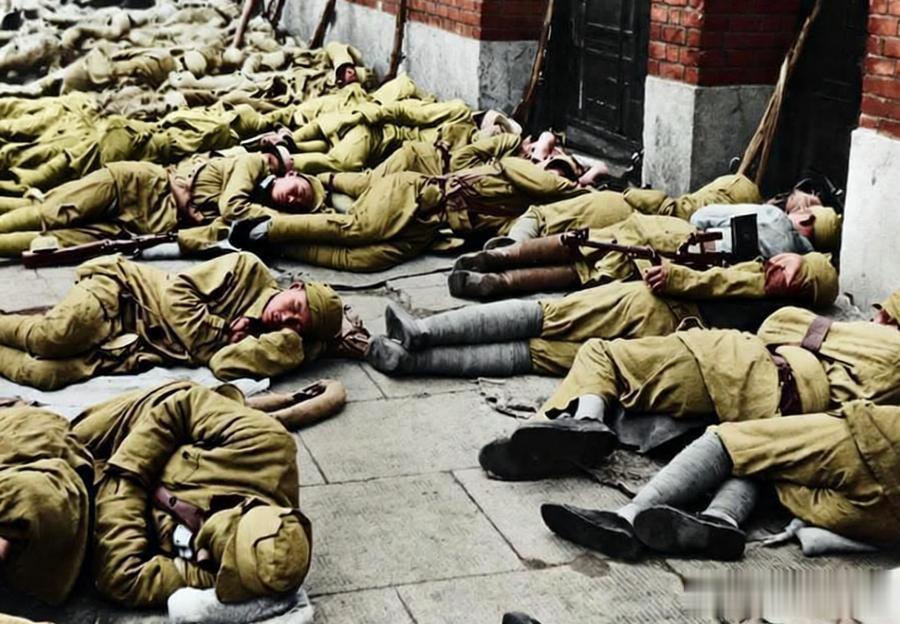 1949年5月27日,上海解放后,南京路潮湿的水泥路面上,密密麻麻露宿着解放军战士,他们或蜷缩、或侧躺,直接以路面为床,身旁还放着随身武器,尽显行军后的疲惫,却没有惊扰周边市民。