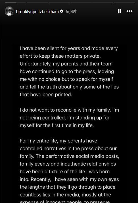 这事儿要搁在以前,谁能想到贝克汉姆家也崩了。就是那家“球王娶辣妹”,全世界都羡慕的幸福模板,这次自家人直接在网上干架了。发生在刚刚过去的星期一,布鲁克林·贝克汉姆大清早在IG上甩一长篇小作文,把自己活了26年的“家务事”往外倒,整得比真人秀还刺激。话说,这哥们终于忍不住了,开口就是“我没退路了,我得为自己说句人话”。这场家庭混战后来愈演愈烈,看得网友从茶几前笑到弹幕区。