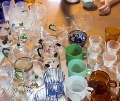 然后胡老师解释说这有的是喝牛奶的,也有的是喝碳酸饮料的,总之这些杯子都是各有各的用处,当初买的时候都有理由,它们都是有存在的意义的。