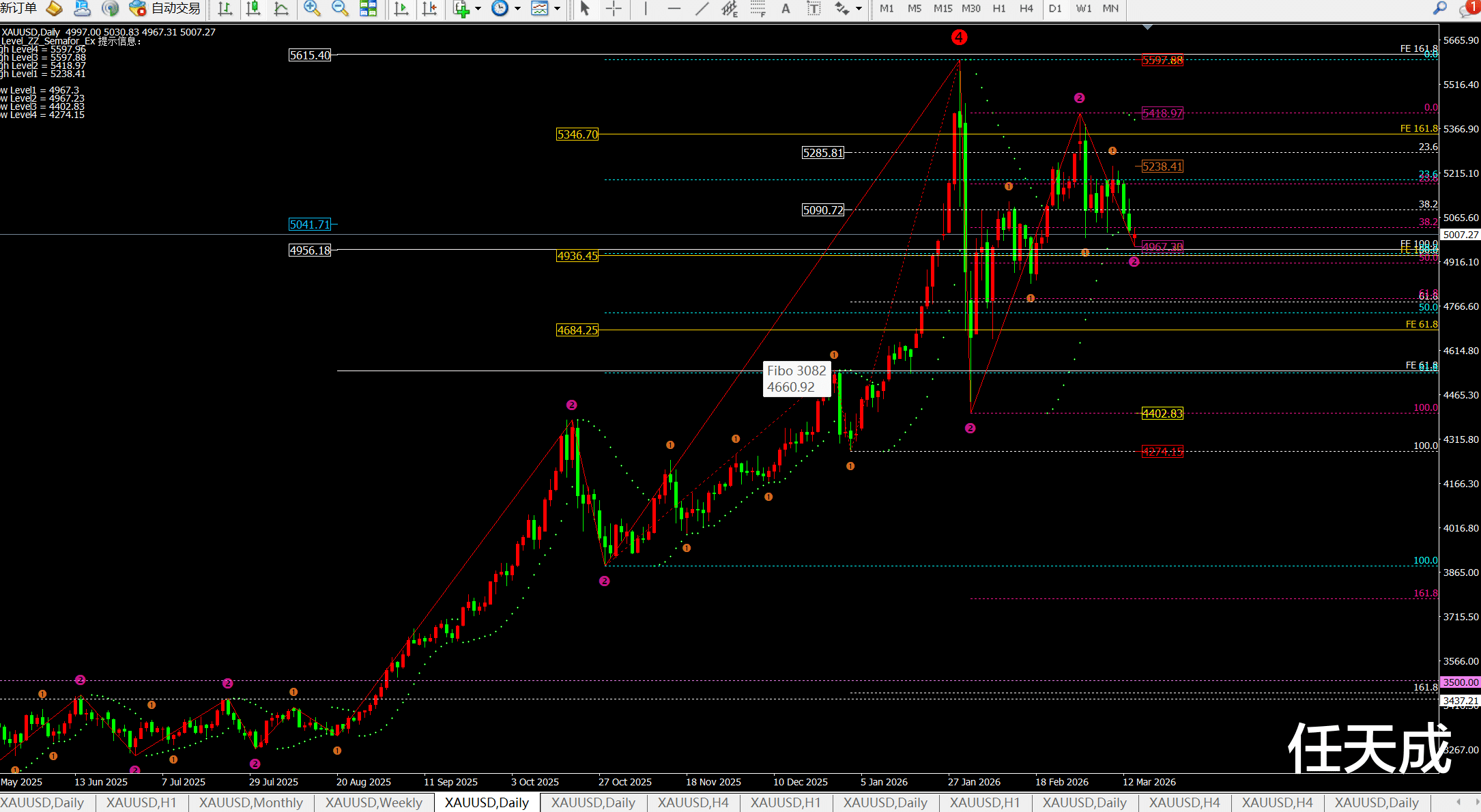 上周一黄金触底5015反弹后周二拉伸至高点5238一线;周三至周五价格继续震荡下跌至5009一线后收线5021一线。从上周日线走势看:价格并没有站稳5192-5200一线,只是虚破后再次下跌,所以5200依旧是当前压制。