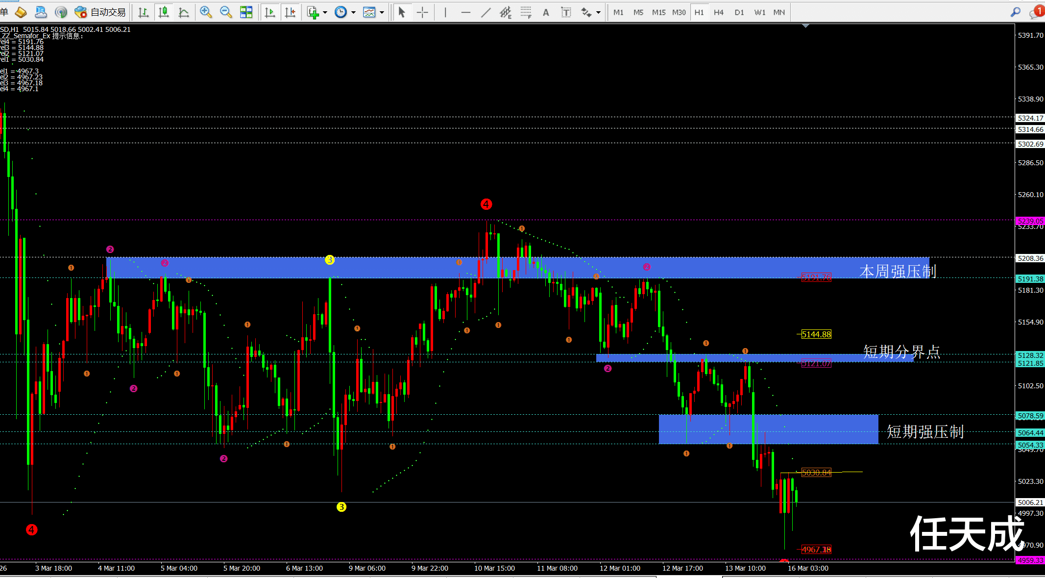 因为5122-5128是上周五的起跌点,所以目前下跌是在其下方,那么5075-5080就是当前的点位。