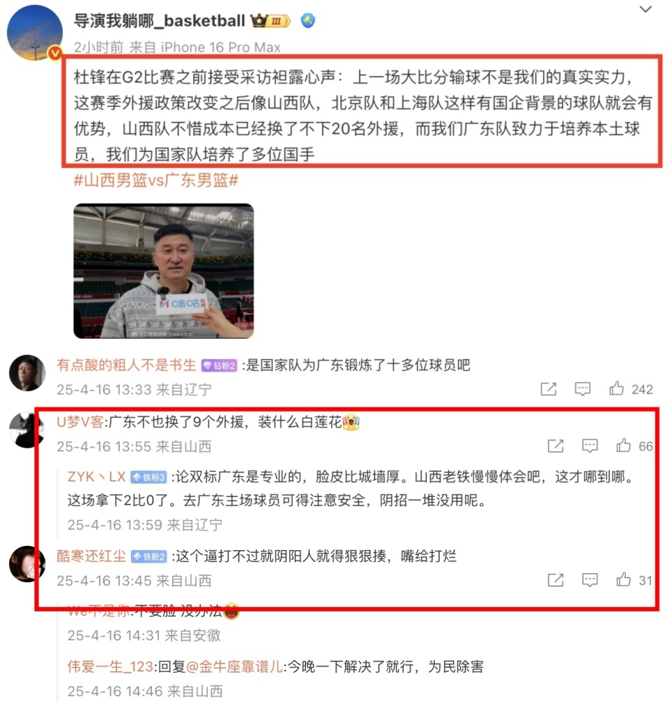 在CBA季后赛G2即将来临之际,广东宏远队主教练杜锋接受了记者的采访,杜锋还提到g2的备战情况:“拼完上海体能受影响,相信队员,第二场不用调整,让他们自己打吧,把他们自己的水平打出来就可以了。”此外,杜锋直言上一场大比分输给山西队并非球队真实实力的体现,直言不讳指出,山西队不惜成本更换了超过20名外援,而广东队始终坚持培养本土球员,为国家队输送了多位国手。他的言辞中既有对联赛环境的无奈,也有对球队的信心。然而,这番表态迅速被辽宁媒体人转发,引发球迷激烈争论,杜锋再惹麻烦,有球迷如坐针毡。(信息源:@导演躺哪)