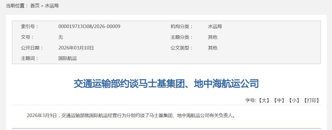 先是交通运输部,根据官网发布的通知公告显示,3月9日交通运输部分别约谈了马士基集团和地中海航运公司有关负责人。
