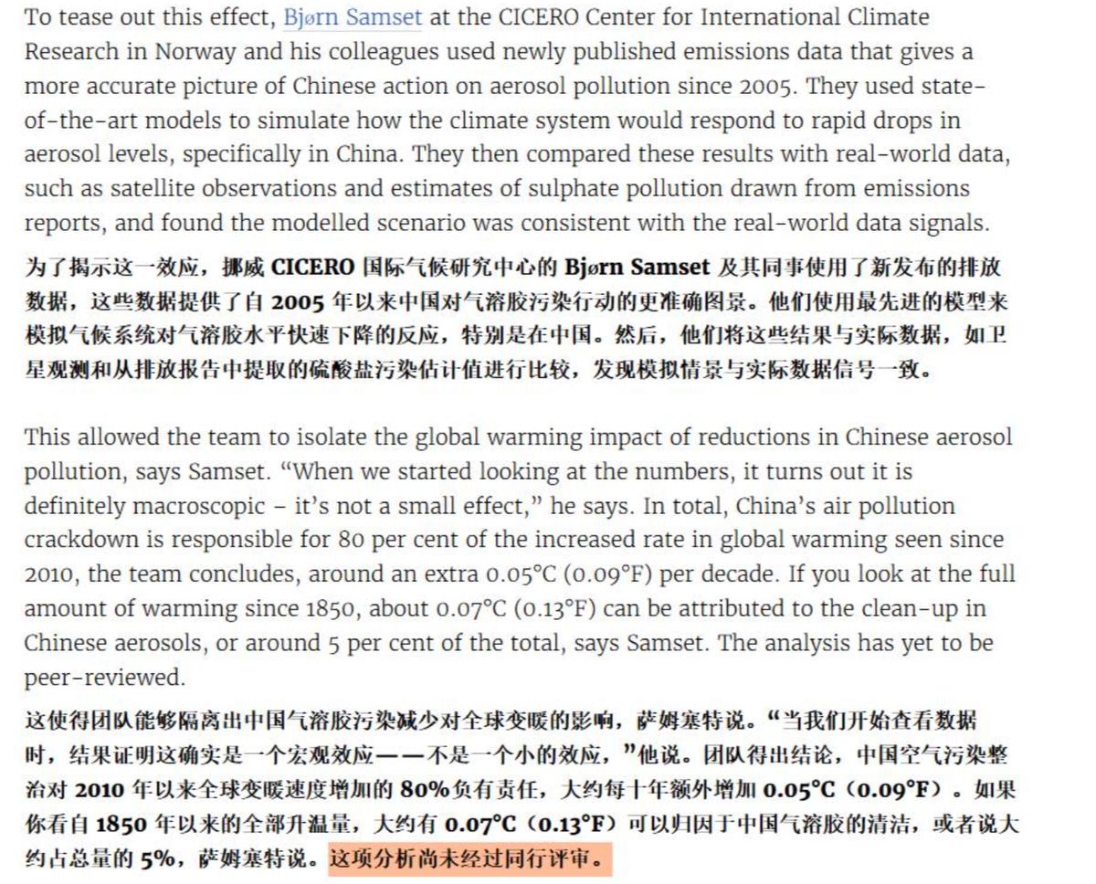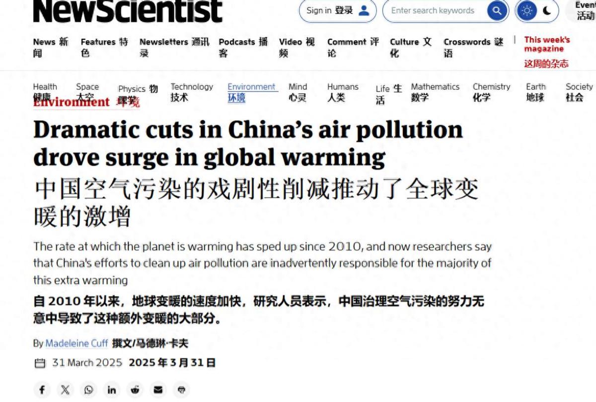 《新科学家》里面的文章,主要是用气溶胶为科普点,告诉大家,如果不是中国一开始排放的如此多的污染物质,全球环境就不可能这么差。现在中国减少了污染物的排放,全球变暖的速度又快。“中国发展需要排污、不行!中国发展学会了环保、也不行!”他们只是不想让中国发展。